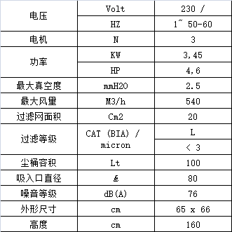 吸尘系统配备3个旁路碳刷型电机,装在钢制保护罩中,分别有单独的控制开关;电机内填充有隔音棉,可以最大程度降低噪音;排气直接通向地面这样可以避免对操作人员造成干扰和在附近区域产生扬尘;控制面板上装有3个独立的开关和1个真空表,能够检查过滤网堵塞情况;侧面装有2个把手,抓住把手可以轻松抬开机头检查或更换过滤网。