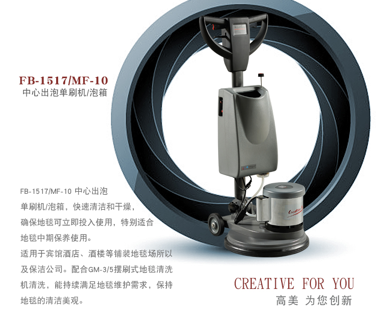 FB-1517/MF-10地毯出泡单刷机,快速干燥的清洁性能,确保地毯及时投入使用,特别适合地毯中期保养使用。适用于宾馆酒店、酒楼等铺装地毯场所以及保洁公司。配合GM-3/5摆刷式地毯清洗机清洗,能持续满足地毯维护需求,提供美观清洁的地毯。